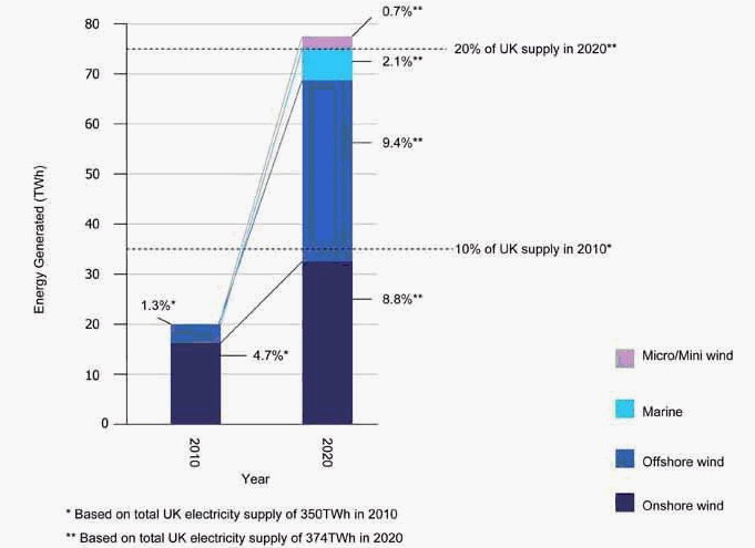 到2020年,英國可再生能源的發(fā)展規(guī)劃如下:1250萬千瓦的陸地風電場裝機容量;1150萬千瓦的海上風電場的裝機容量;300萬千瓦的海洋可再生能源。