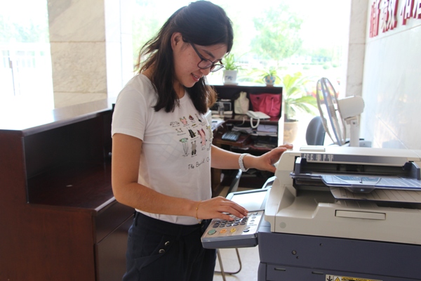 小俞是個(gè)熱心腸的人,同事工作忙,她就幫助他們打印需要的資料,還會(huì)教同事如何使用打印機(jī)和傳真機(jī)。小俞樂(lè)觀開(kāi)朗的性格也感染到身邊的每一位同事,然他們?cè)谟淇斓臍夥罩袝簳r(shí)忘掉夏天的炎熱。