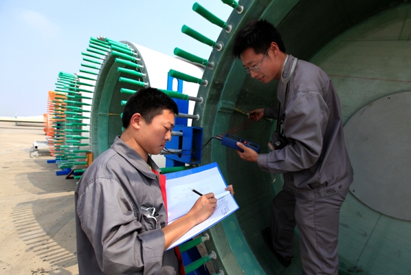 目前中復(fù)連眾生產(chǎn)的葉片最短的有34米,最長的達(dá)到超過60米,這就造成擺放這些葉片的場地非常大,連云港生產(chǎn)基地的貨場大約300畝。廣闊的貨場繞行一周至少需要半個(gè)小時(shí),工作內(nèi)容暫且不說,光是每天在貨場上來回走上幾趟,很多人都吃不消,加上酷暑寒冬,風(fēng)吹雨淋,讓人望而生畏。葉片噴漆完畢到等待發(fā)貨這段時(shí)間,賈效博會(huì)將對(duì)葉片進(jìn)行航空標(biāo)識(shí)、內(nèi)部檢查、后緣厚度、螺栓、葉片翼型檢查、人孔板等14個(gè)大類60多小項(xiàng)的檢查,從根部到尖部,從外表面到葉片內(nèi)里,有的需要肉眼觀察,有的需要儀器測量,需要嚴(yán)格對(duì)照工藝要求,逐項(xiàng)檢查,對(duì)檢查到的不合格項(xiàng)還要反饋給相關(guān)部門,請(qǐng)他們處理,然后再進(jìn)行一輪檢查,直至符合出廠標(biāo)準(zhǔn)。遇到發(fā)貨時(shí)間比較急,或者是出口訂單,他的任務(wù)就更艱巨了,加班加點(diǎn)不說,對(duì)同一只葉片他要看好幾次,確認(rèn)沒有問題了,他才會(huì)給客戶監(jiān)理看。