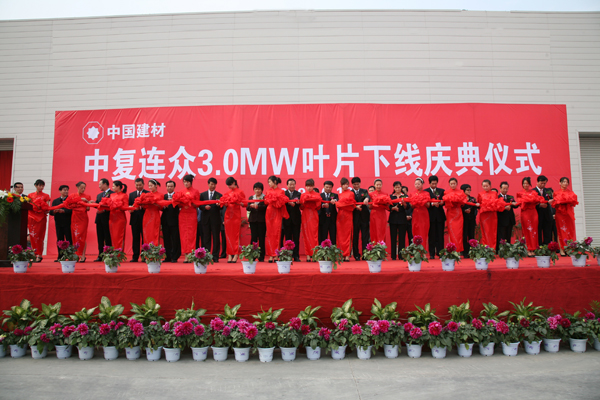 10月18日,連云港中復(fù)連眾復(fù)合材料集團的葉片工廠和連云港市文化藝術(shù)中心花團錦簇,中復(fù)連眾3兆瓦風(fēng)力葉片下線儀式和20周年慶典隆重舉行。國務(wù)院國資委監(jiān)事會主任陳琦良,國家工信部規(guī)劃司副司長劉樹蘋,國家科技部能源處副處長譚可榮,中國建筑材料集團公司總經(jīng)理姚燕,中國建材集團外部董事曹德生、王振侯、郭建堂,中國建筑材料聯(lián)合會副會長陳國慶,中國建材報社社長陳才來,中國復(fù)合材料集團有限公司董事長張定金,華銳風(fēng)電科技股份有限公司董事長、總裁韓俊良,金風(fēng)科技股份有限公司總裁郭健等參加了3兆瓦葉片下線儀式和中復(fù)連眾成立20周年慶典。