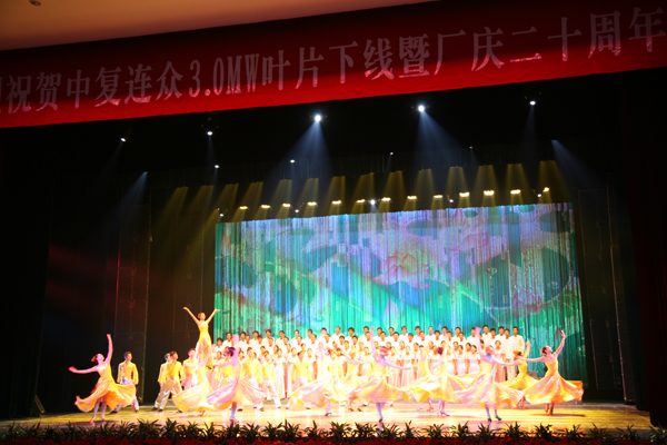 國家發(fā)改委能源研究所副所長李俊峰,中國可再生能源學(xué)會風(fēng)能專業(yè)委員會秘書長秦海巖,中國農(nóng)機協(xié)會風(fēng)力機械分會秘書長祁和生,中國建材雜志社秦春雨,來自沈陽、酒泉和包頭的地方領(lǐng)導(dǎo),中國建材集團及其下屬企業(yè)的領(lǐng)導(dǎo),以及包括上海電氣、東方汽輪機公司、湘電風(fēng)能等在內(nèi)的中復(fù)連眾國內(nèi)外合作伙伴及客戶、員工等歡聚一堂。南京軍區(qū)前線文工團為中復(fù)連眾20周年慶典獻上了精彩文藝節(jié)目,共祝“中復(fù)連眾輝煌20年”。慶典在中復(fù)連眾數(shù)百名員工的合唱中“風(fēng)啊風(fēng),吹啊吹,我的翅膀跟著飛……”推向了高潮。