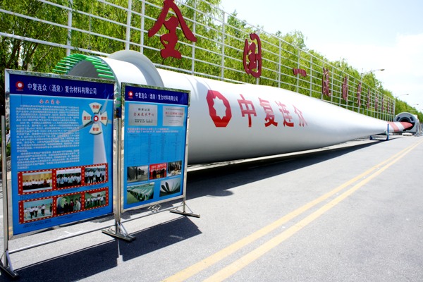 6月21日-22日,由省政府和中國國際貿(mào)易促進(jìn)委員會(huì)主辦的2013年中國(甘肅)國際新能源博覽會(huì)暨酒泉投資合作洽談會(huì)在酒泉市隆重舉行。中復(fù)連眾(酒泉)復(fù)合材料有限公司攜3MW-55米風(fēng)力機(jī)葉片亮相展會(huì)。