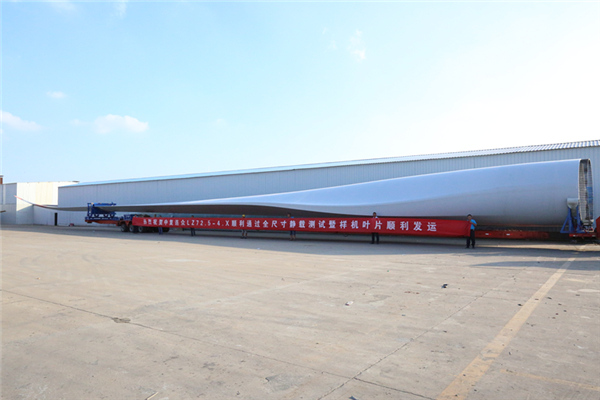 2018年7月20日,由中復(fù)連眾研發(fā)生產(chǎn)的LZ72.5-4.X海陸通用型風(fēng)機(jī)葉片順利通過(guò)全尺寸靜力測(cè)試,并完成首套樣機(jī)葉片發(fā)運(yùn)。該葉片的風(fēng)輪直徑148米,根部圓3200mm,葉片長(zhǎng)度72.5米,容量4.XMW,重量20.5噸。
